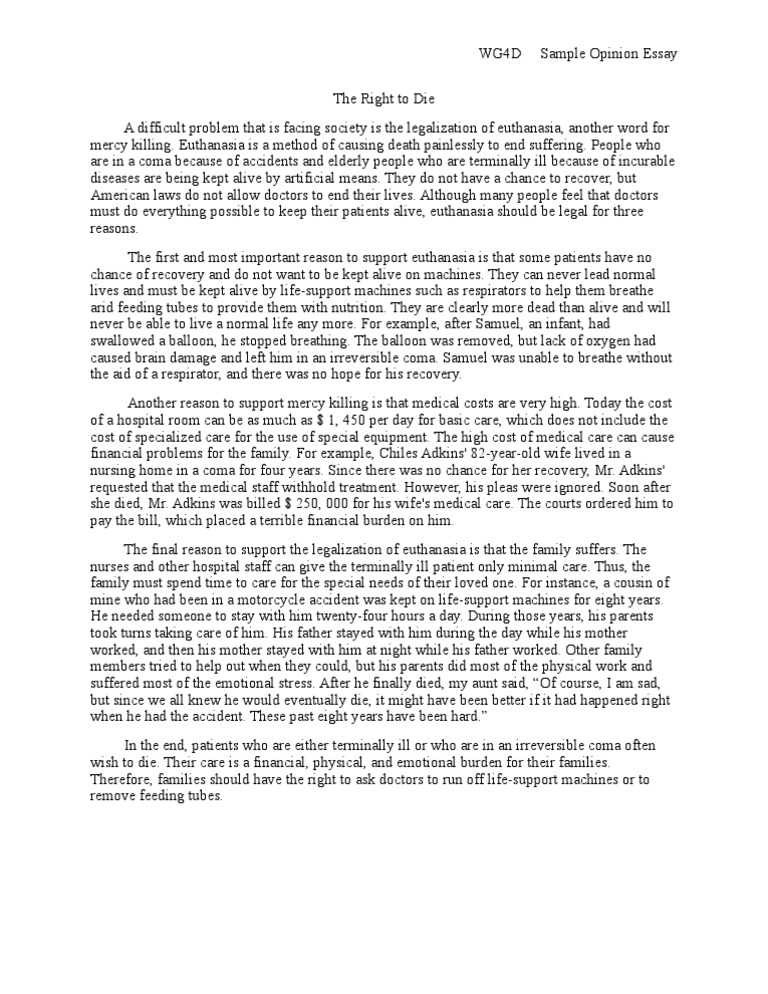 Mar 21, · Essay: The right to die March 21, AIX-EN-PROVENCE, France — 'Every person shall have the right to die with dignity; this right shall include the right to choose the time of one's death Estimated Reading Time: 4 mins May 19, · Home — Essay Samples — Social Issues — Assisted Suicide — Euthanasia, Assisted Dying And The Right To Die This essay has been submitted by a blogger.com The Fourteenth Amendment - the Right to Die free essay and over 89, other research blogger.com right to die is a patient’s ability to choose their own time and means of death The Right To Die Essay Words | The right to die simply means The right of a terminally ill person to refuse life-sustaining treatment. The right to die has been a heavily debated topic for many years, and there are proponents on both sides who strongly believe they are the one with the right answer. The only right answer I see is to give every individual the right to choose what kind of life they want to live all the way through to death